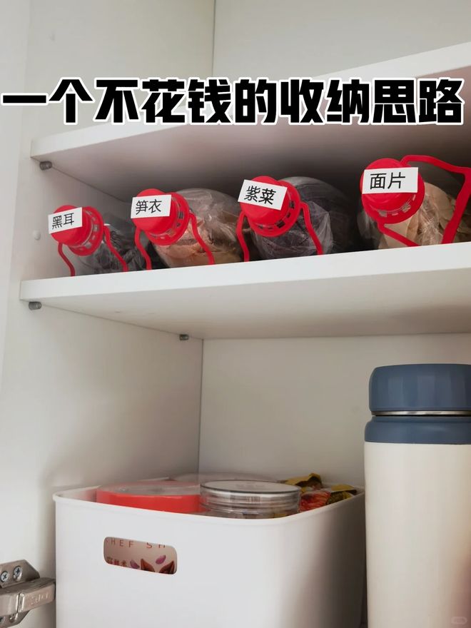 那个镜头就是少花钱,少买东西,利用已有的东西进行再利用,把收集的矿泉水瓶放在厨房用来收纳一些干货挂面特别方便,密封性很好,