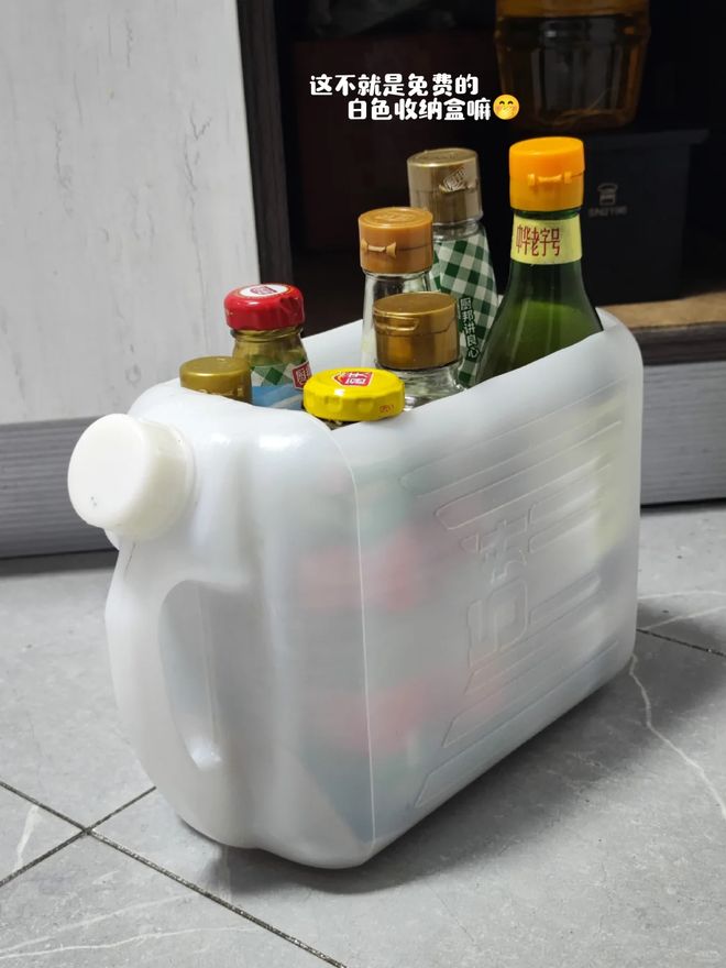 厨房调味料瓶瓶罐罐放在柜子里面不好拿取,也不用单独去买置物架,其实家里有用完的空油桶可以刷洗干净,在上面开一个孔,立马就变身抽拉式的收纳盒,