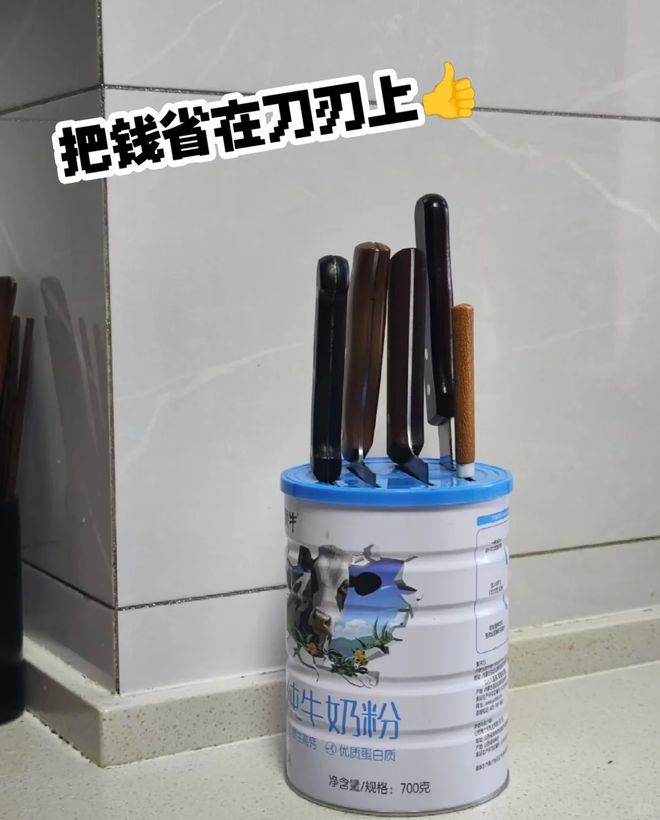 如果家里没有刀具架,你可以自己制作一个免费的道具家,孩子喝完的奶粉罐可以将奶粉罐上面的盖子剪开合适的大小,然后把刀具插在里面,没花一分钱搞定刀具收纳架租房党适用。