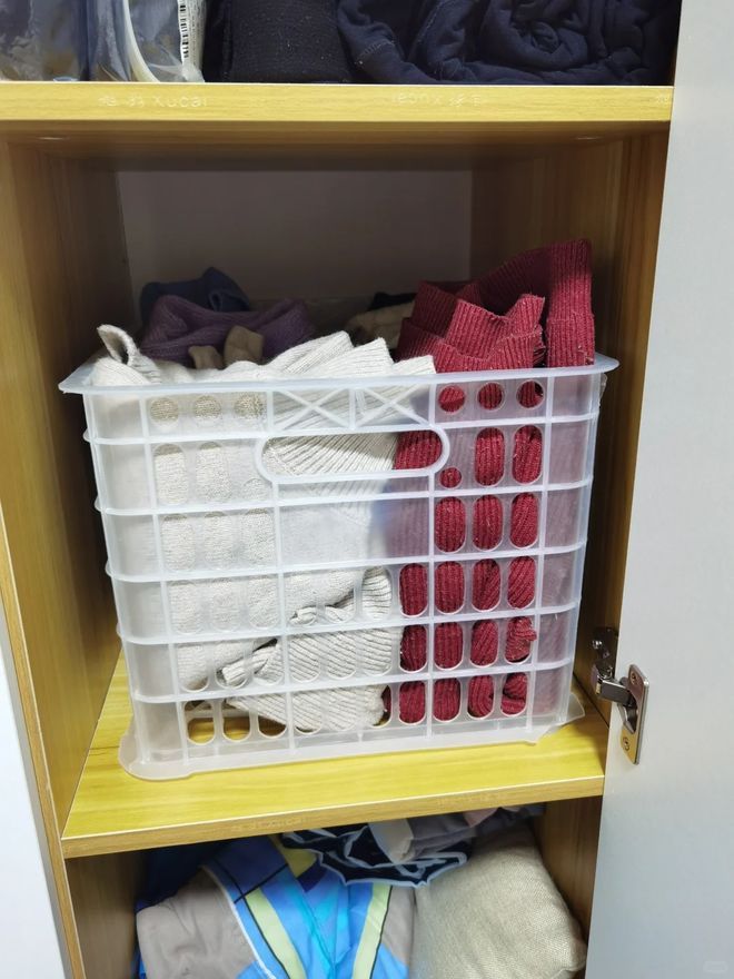 剩下的这种水果筐可以清洗干净放在衣柜当中用来收纳衣服,如果您觉得不好看,也可以用碎花布装饰一下,一分钱没花衣服收纳筐。