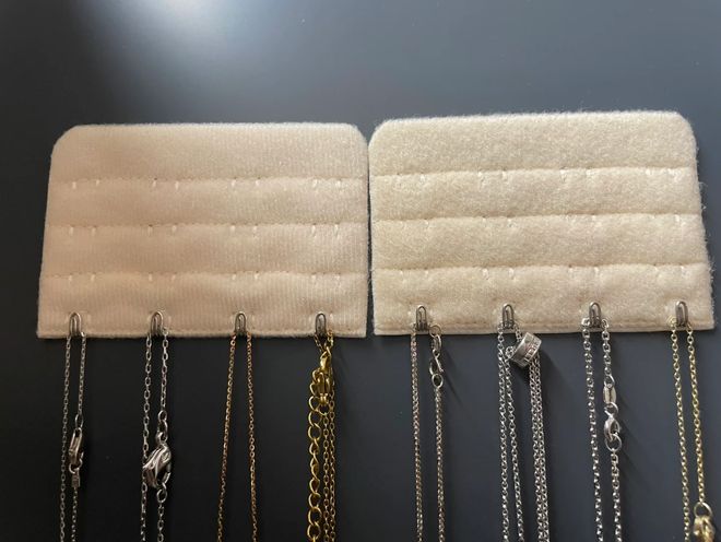 教你一个妙招,不花钱的收纳首饰,可以将不穿的内衣上面的扣子取下来,然后固定在合适的位置上,上面的小钩子就可以用来画首饰了。