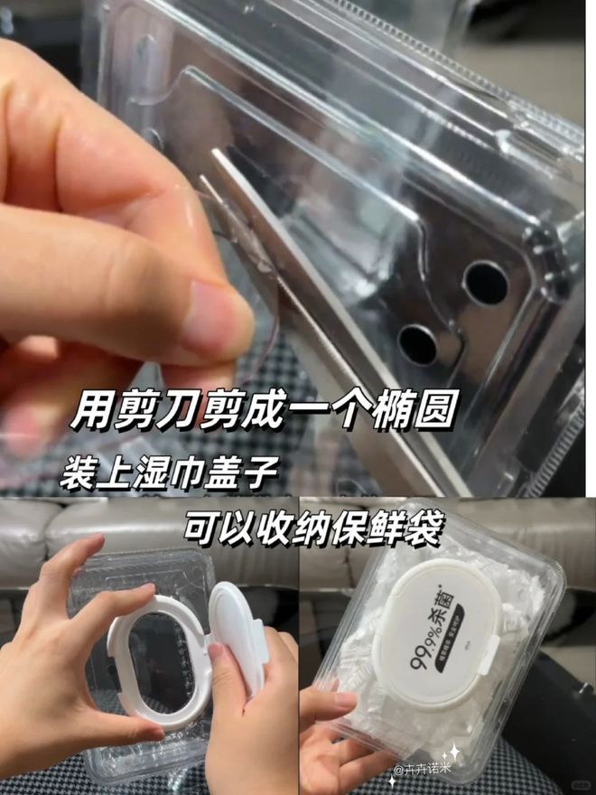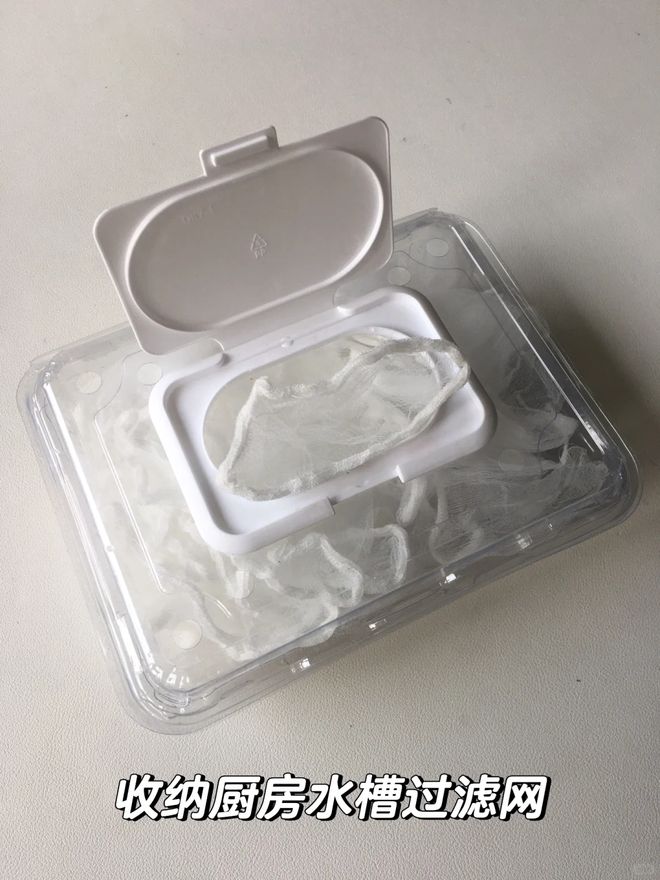 把用完的湿巾上面的盖子取下来,直接粘在水果盒上,然后把中间掏空收纳厨房的一次性过滤网或者是保鲜膜都很不错,可以防水防油打开湿巾盖子随用随取,特别方便。