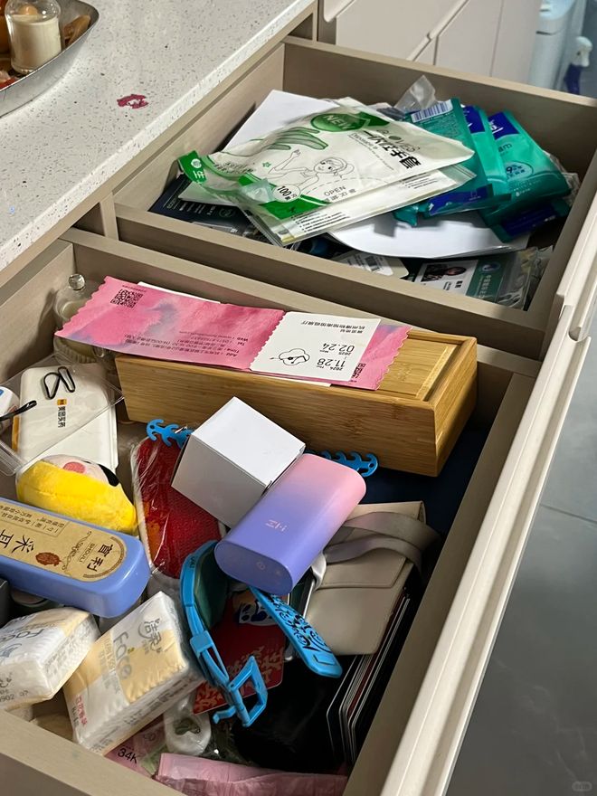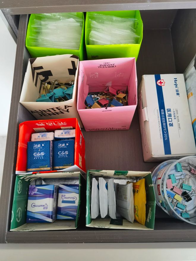 把纸质的包装袋完整一下,然后放在抽屉里,这样乱七八糟的东西可以分类收纳,让抽屉里面更加整齐,来平替牛皮纸。